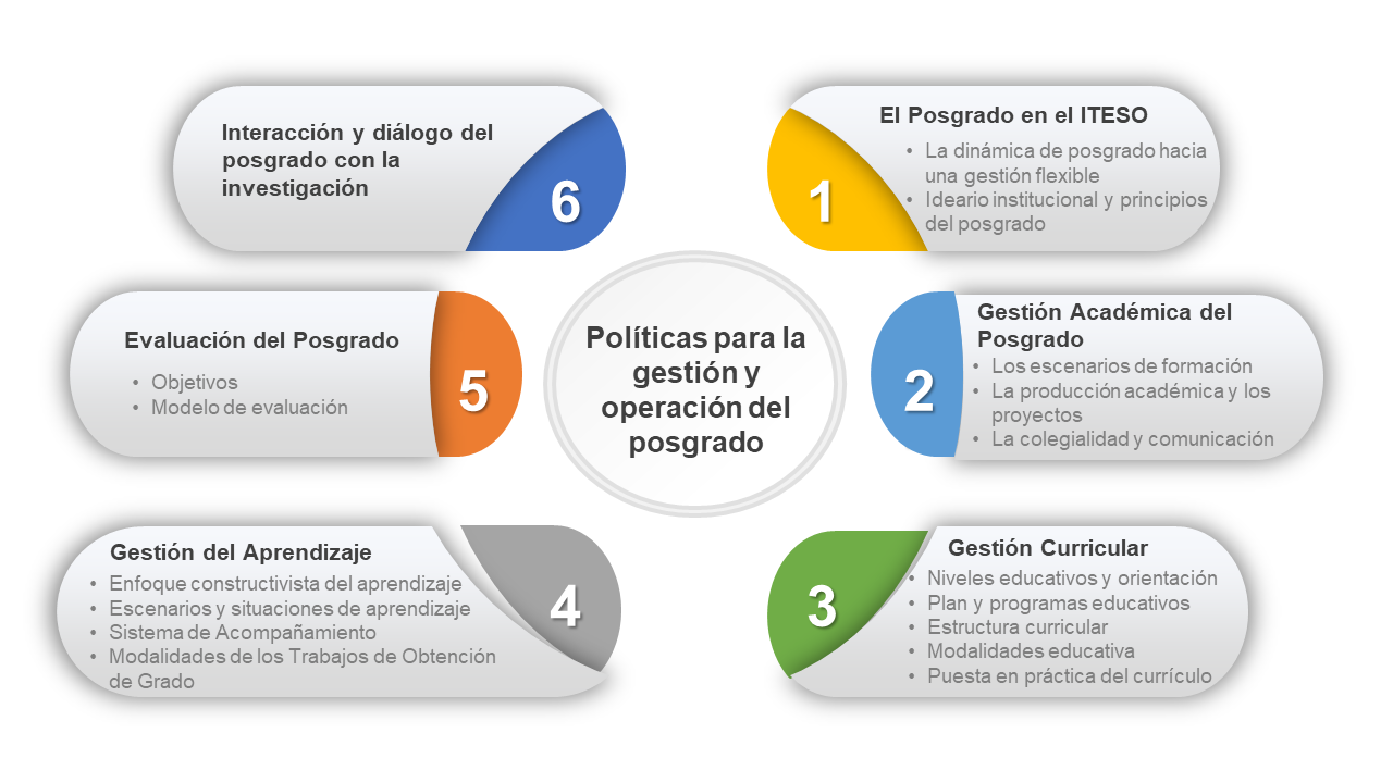 Las Políticas para la Gestión y Operación del Posgrado del ITESO son el resultado del diálogo y el trabajo colegiado basado en la recuperación de los aprendizajes y experiencias de los últimos años. Las cuales tienen su base en los referentes comunes emanados de la publicación "Reestructuración del posgrado en el ITESO", emitida en 2011, con el fin de redefinir y presentar procesos, sistemas, métodos de actuación y elementos normativos que configuran el desarrollo del mismo.